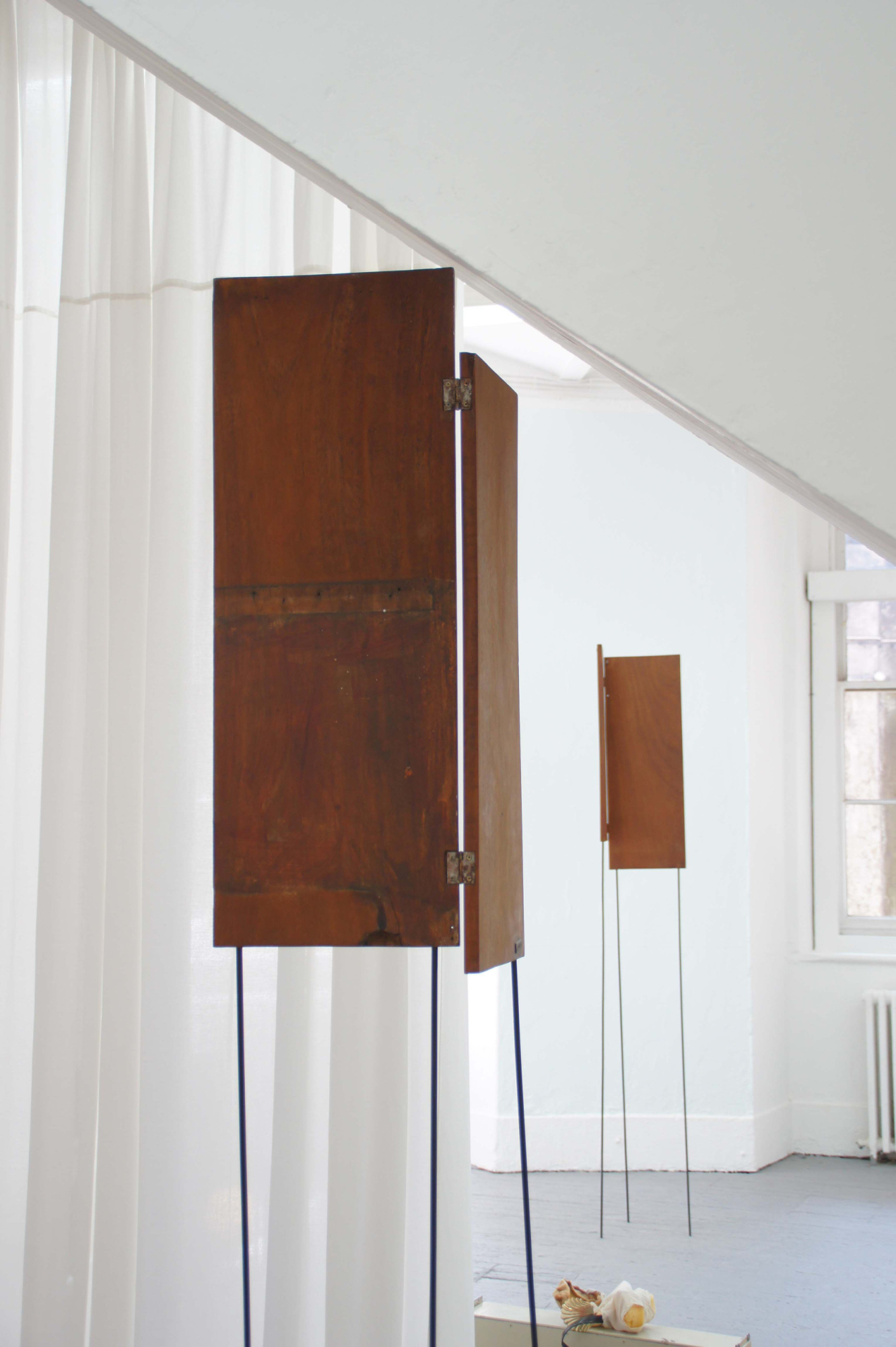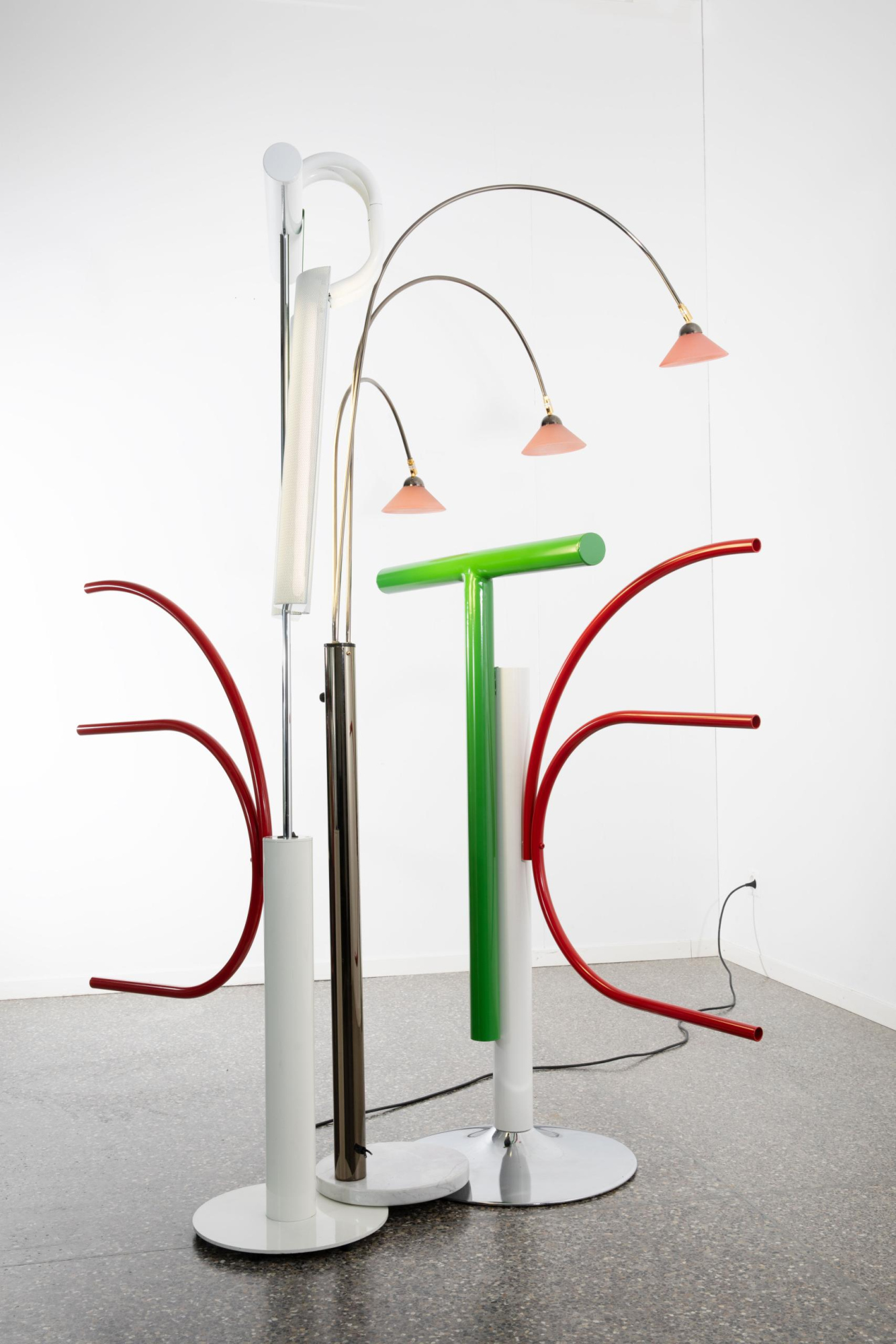 Found objects, powdercoated steel, pins, thread, epoxy, LED bulp.