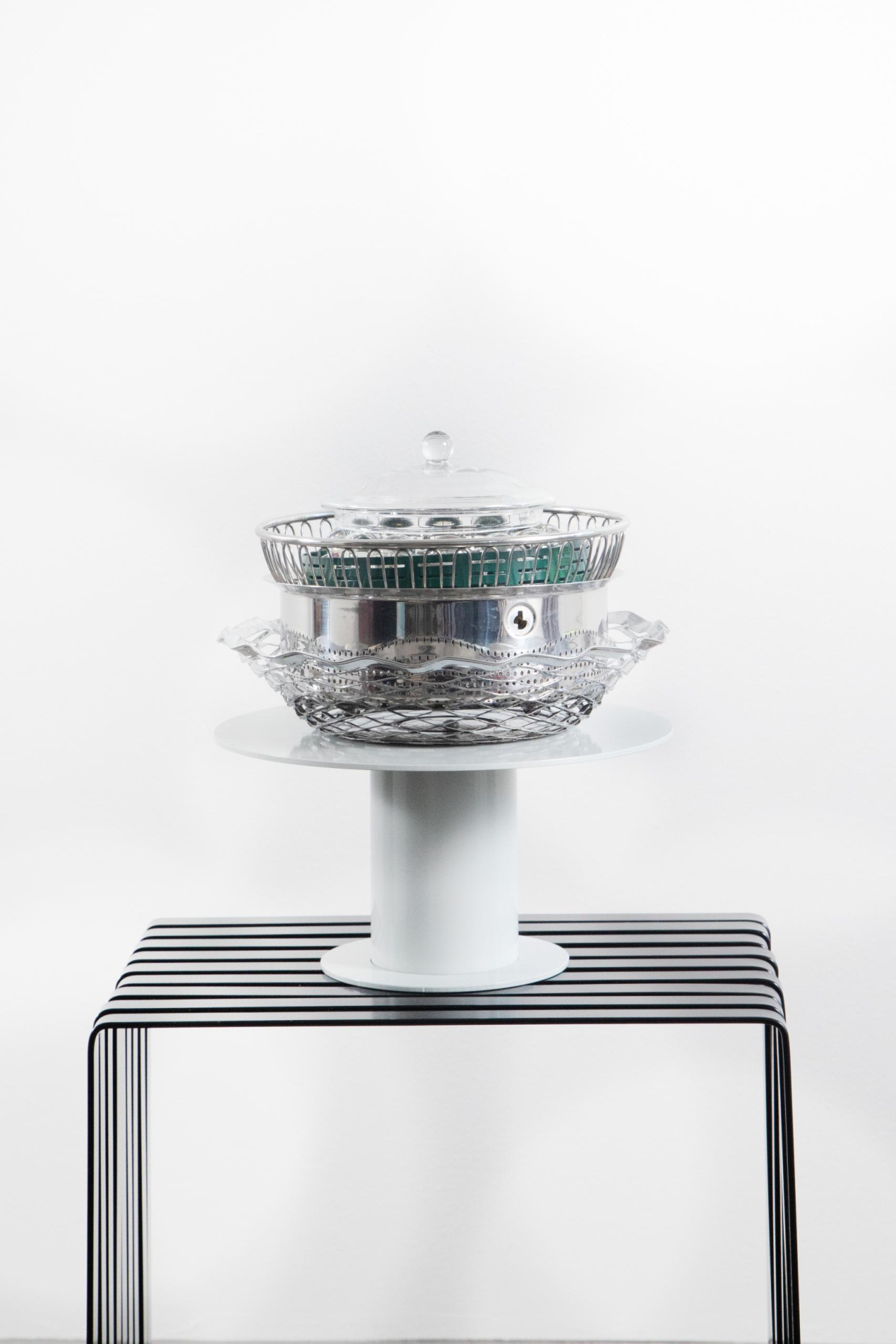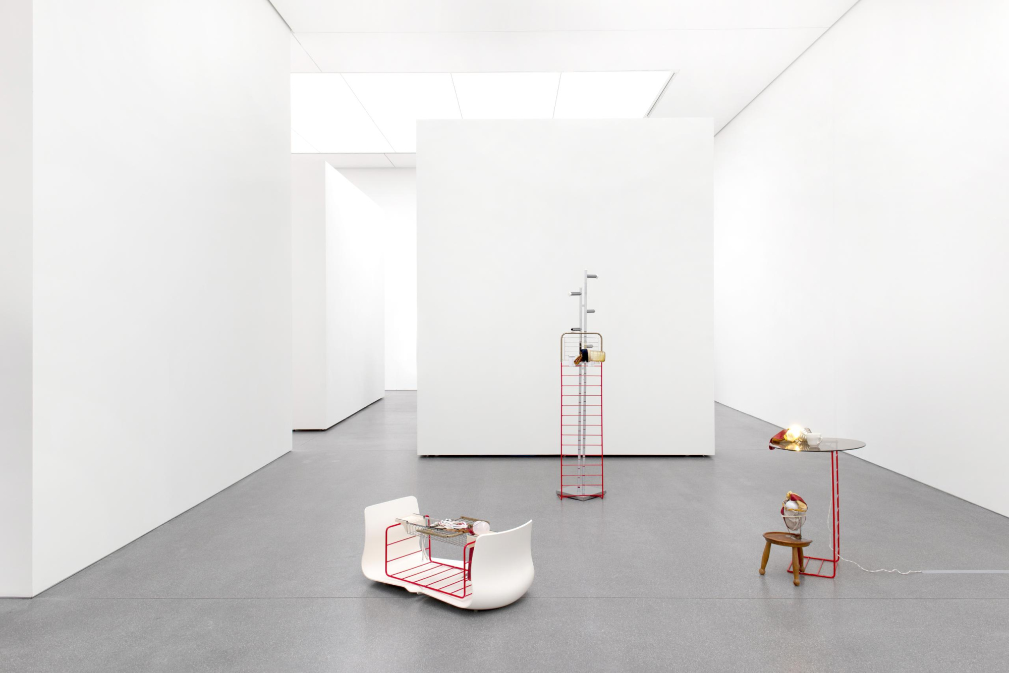 Teatime with Lillies of the Valley (to Lilly Reichs Custom MR 20 Chair); 2025; Steel powdercoated in May Green and Pure White, Aluminium powdercoated in Signal Red, various things discarded and found on the roadside; 50 x 195 x 90 cm