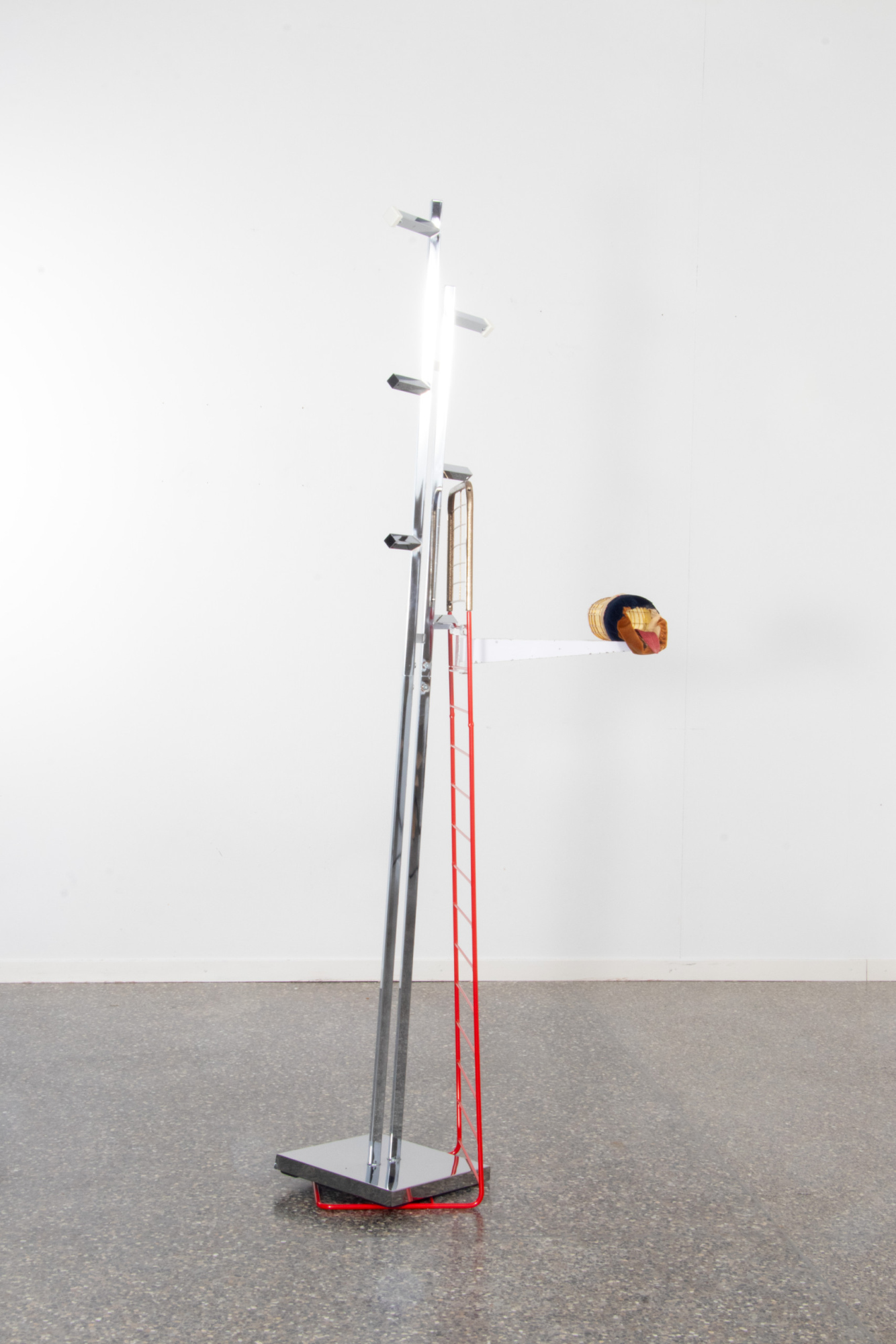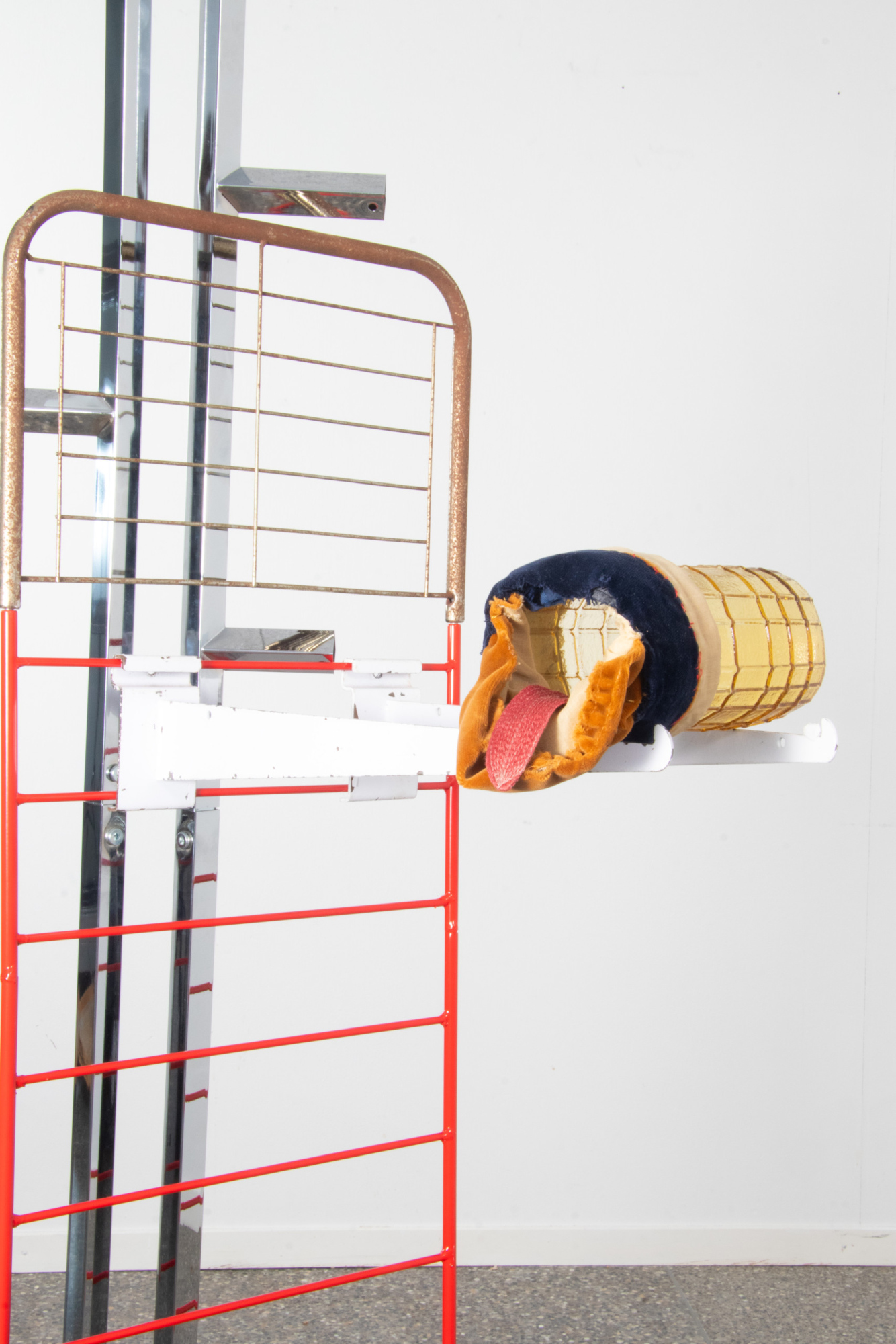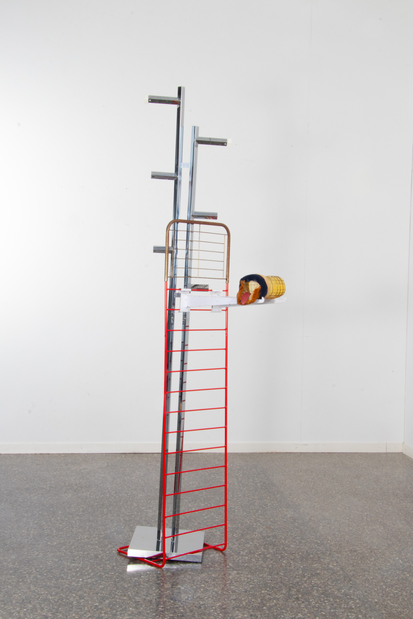 Balance a Cake, Rock a Star, Nurse a Bird of Paradise Flower and Release Tensions between Ribs, 2025; Steel Podercoated with Sand Yellow, Red Lilac, Purple Violet; Chrome Steel; Epoxy; Various things discarded and found on the roadside; 100 x 60 x 130 cm